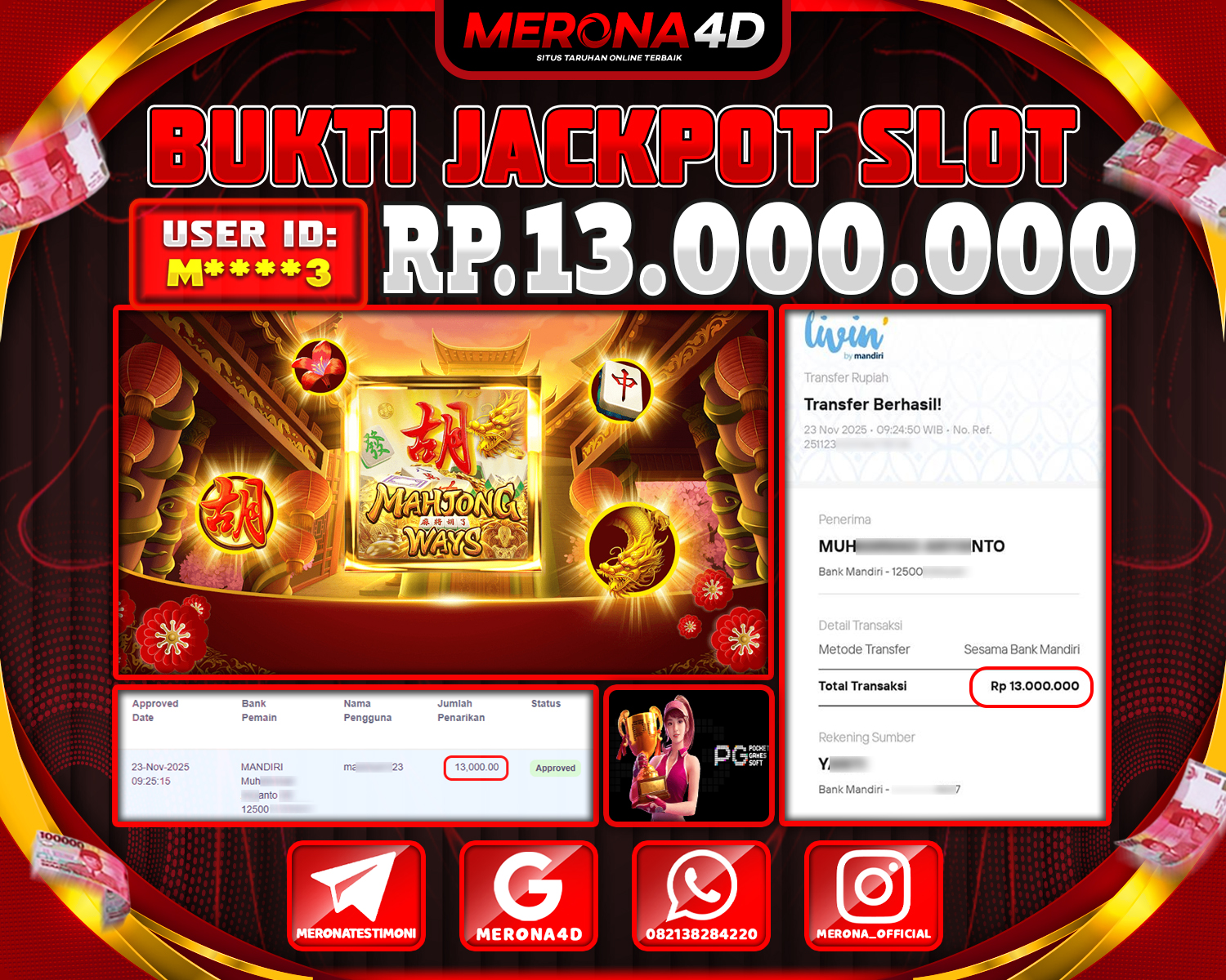 Selamat Kepada Member MERONA4D M****3 Telah Jackpot Di MAHJONG WAYS
