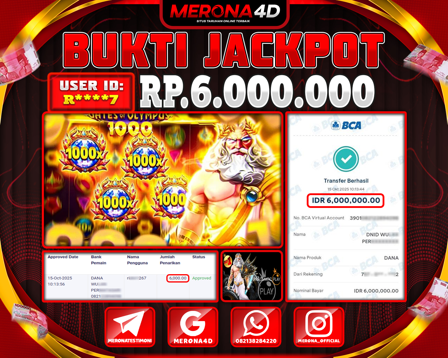 Selamat Kepada Member MERONA4D Rβ­‘οΏ½***οΏ½β­‘1 Telah Jackpot Di GATES OF OLYMPUS 1000