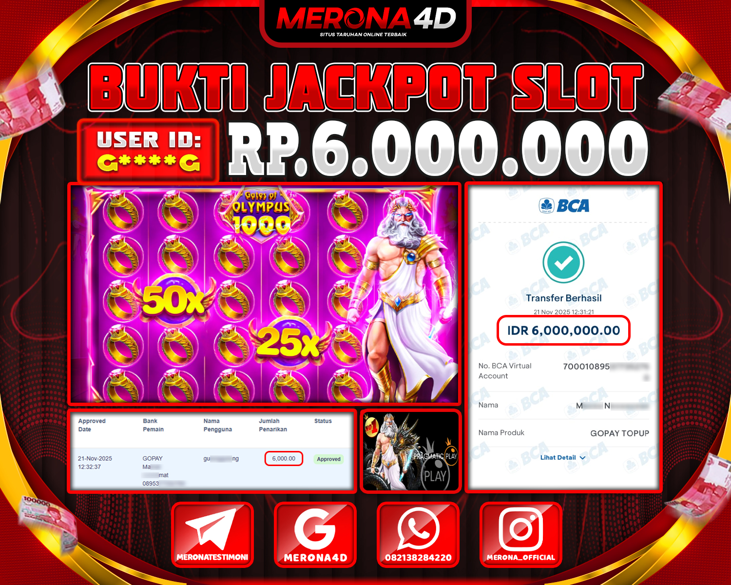 Selamat Kepada Member MERONA4D G***** Telah Jackpot Di GATES OF OLYMPUS 1000