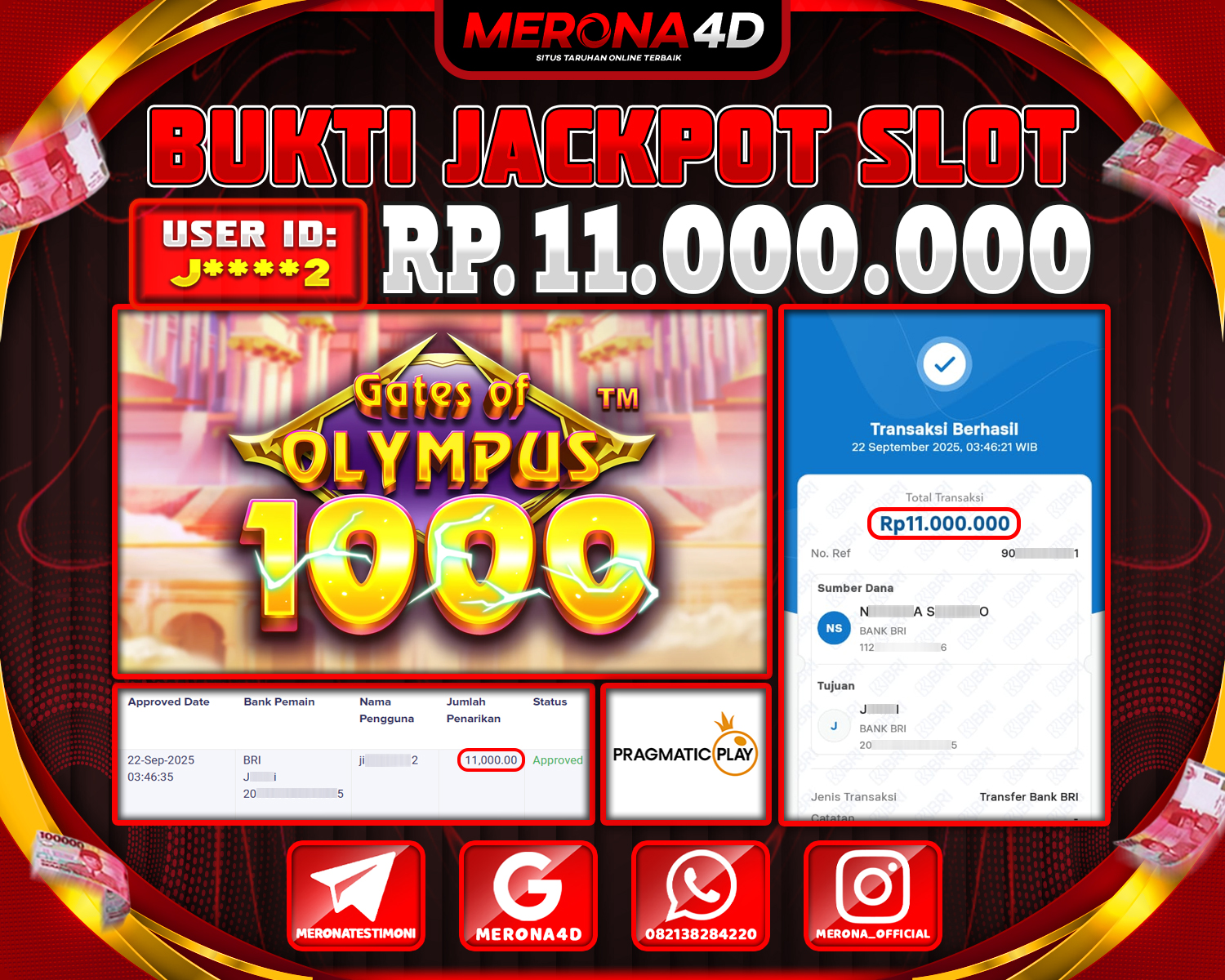 Selamat Kepada Member MERONA4D J****2 Telah Jackpot Di GATES OF OLYMPUS 1000