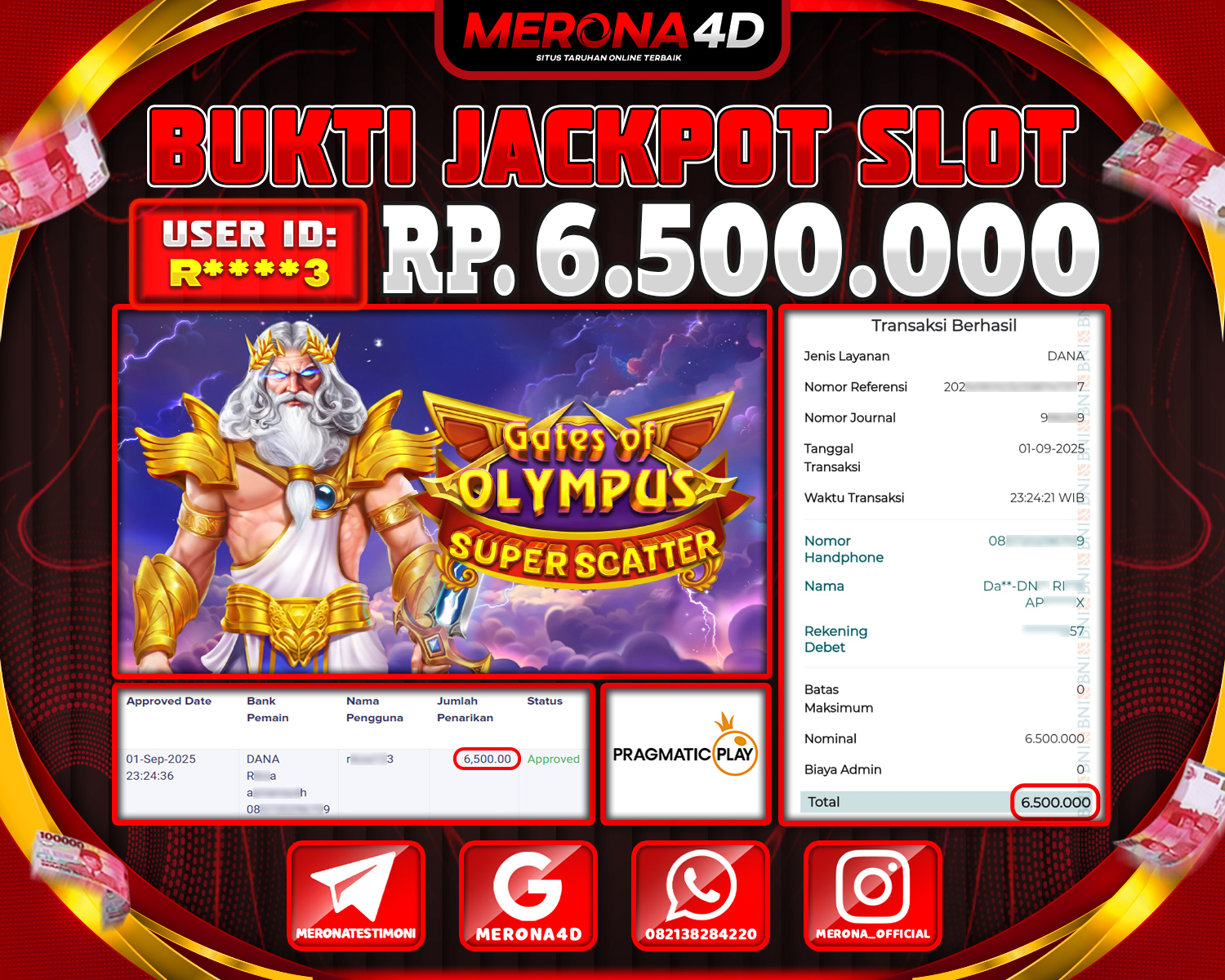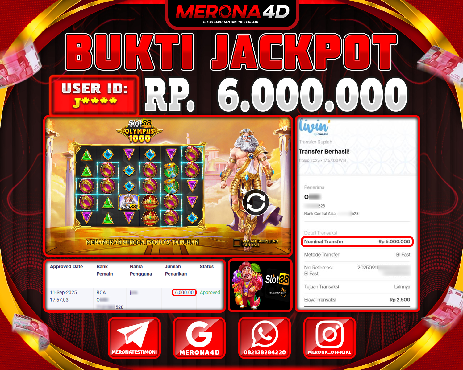 Selamat Kepada Member MERONA4D J***** Telah Jackpot Di SLOT88 OLYMPUS 1000
