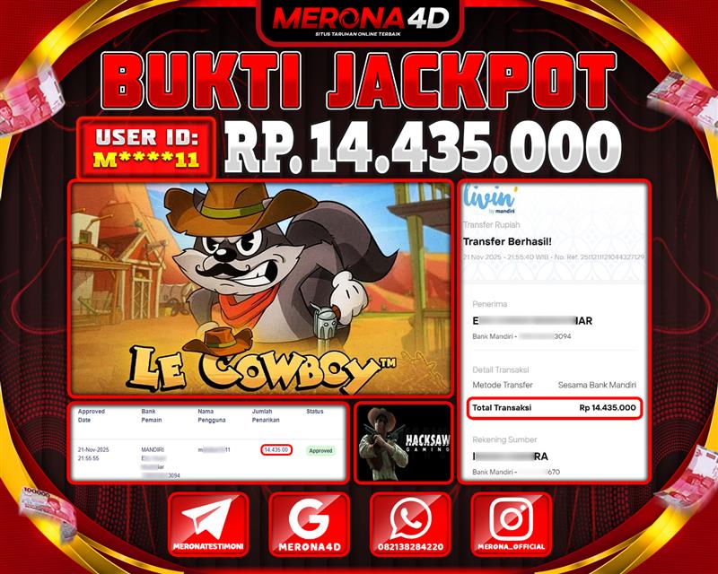 Selamat Kepada Member MERONA4D M*****11 Telah Jackpot Di LE COWBOY