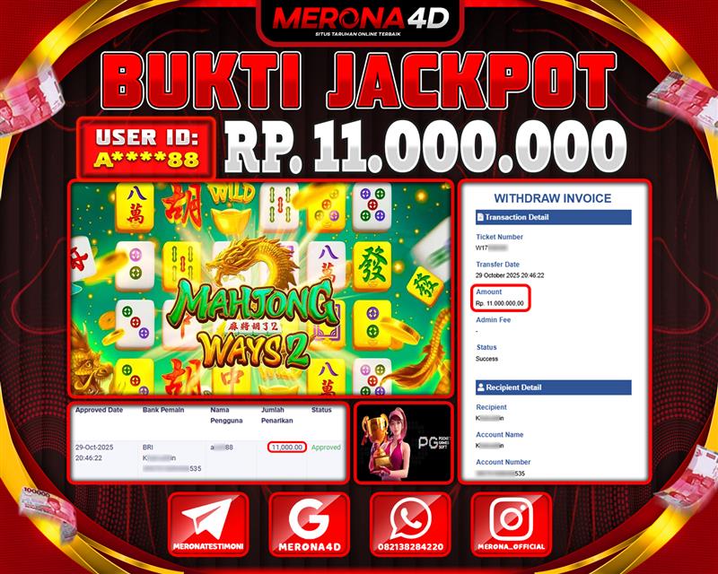 Selamat Kepada Member MERONA4D A*****88 Telah Jackpot Di MAHJONG WAYS 2