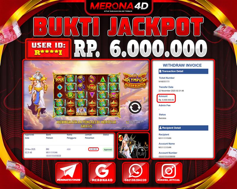 Selamat Kepada Member MERONA4D R*****I Telah Jackpot Di GATES OF OLYMPUS SUPER SCATTER