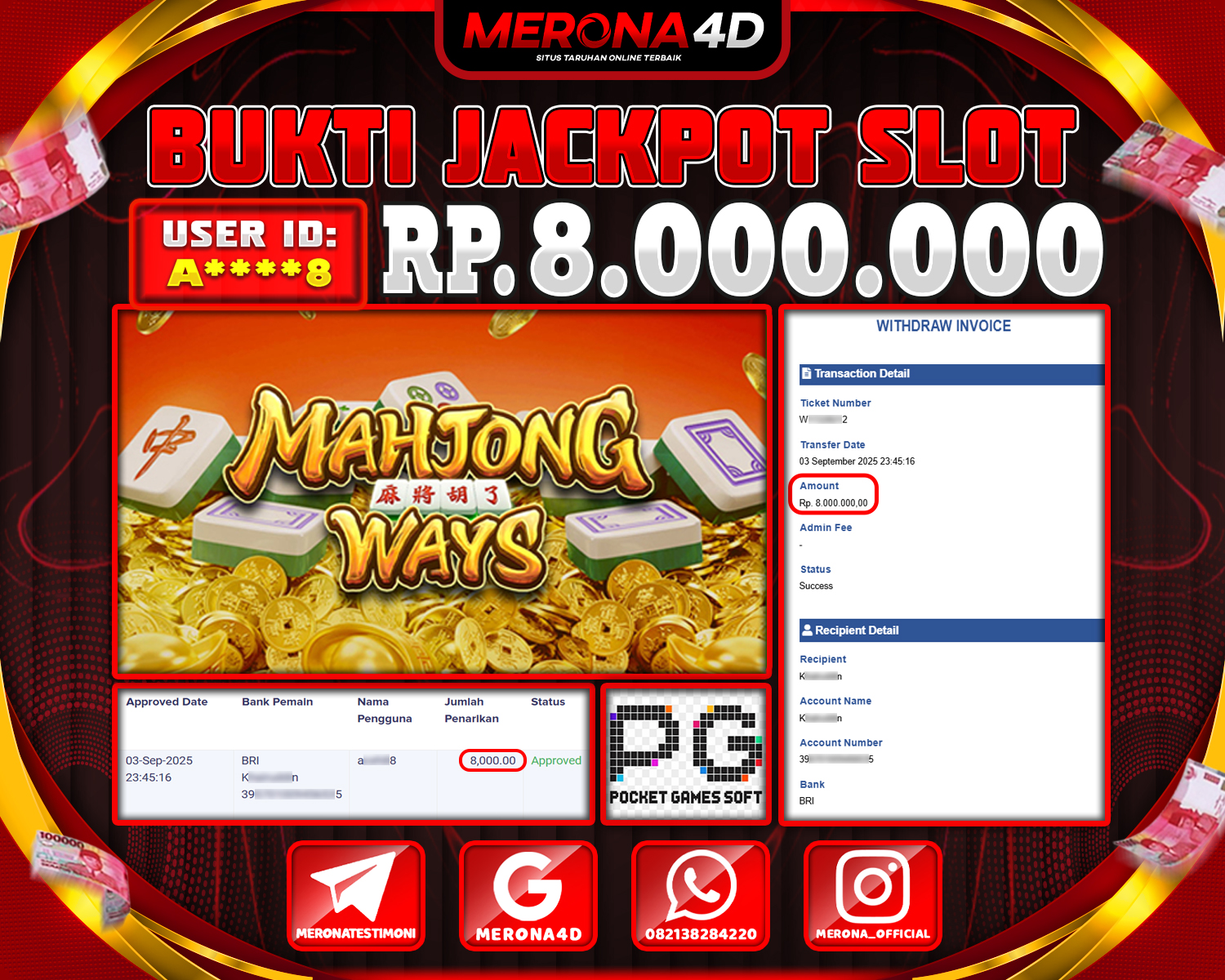 Selamat Kepada Member MERONA4D A****8 Telah Jackpot Di MAHJONG WAYS