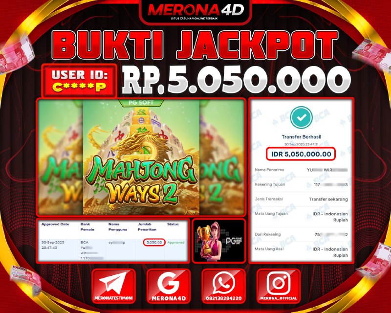 Selamat Kepada Member MERONA4D B****7 Telah Jackpot Di MAHJONG WAYS 2
