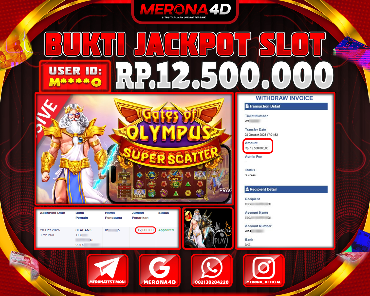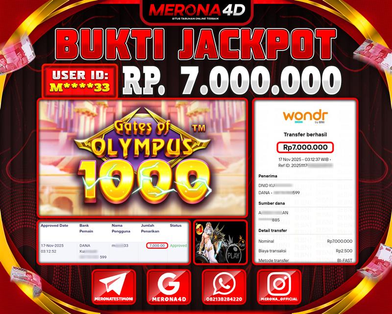 Selamat Kepada Member MERONA4D M*****33 Telah Jackpot Di GATES OF OLYMPUS 1000