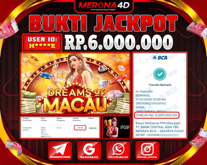 Selamat Kepada Member MERONA4D H*****E Telah Jackpot Di DREAMS OF MACAU