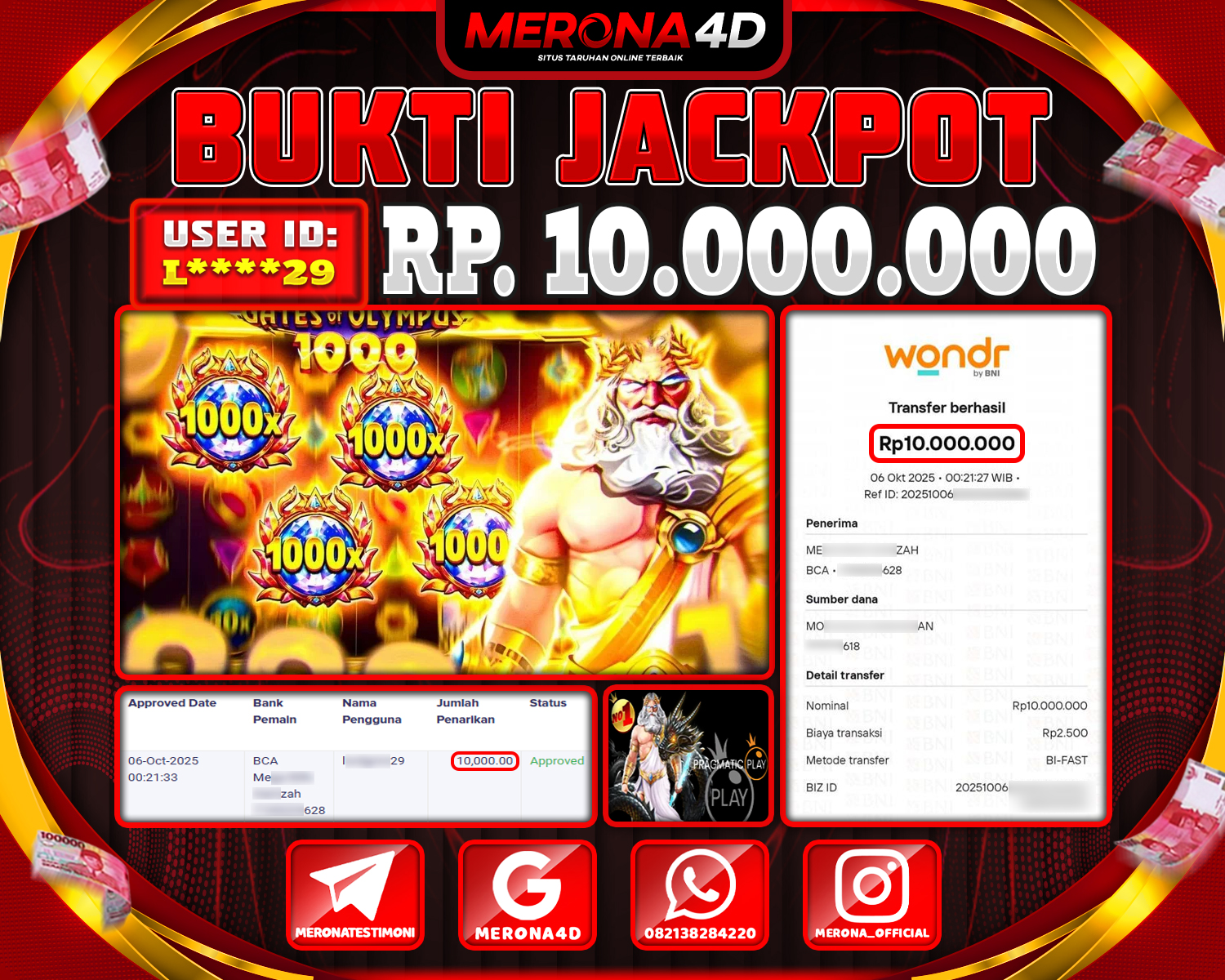 Selamat Kepada Member MERONA4D L*****29 Telah Jackpot Di GATES OF OLYMPUS 1000
