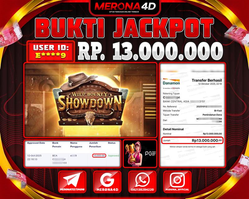 Selamat Kepada Member MERONA4D E*****9 Telah Jackpot Di WILD BOUNTY SHOWDOWN