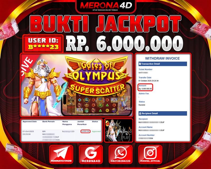 Selamat Kepada Member MERONA4D B*****23 Telah Jackpot Di GATES OF OLYMPUS SUPER SCATTER