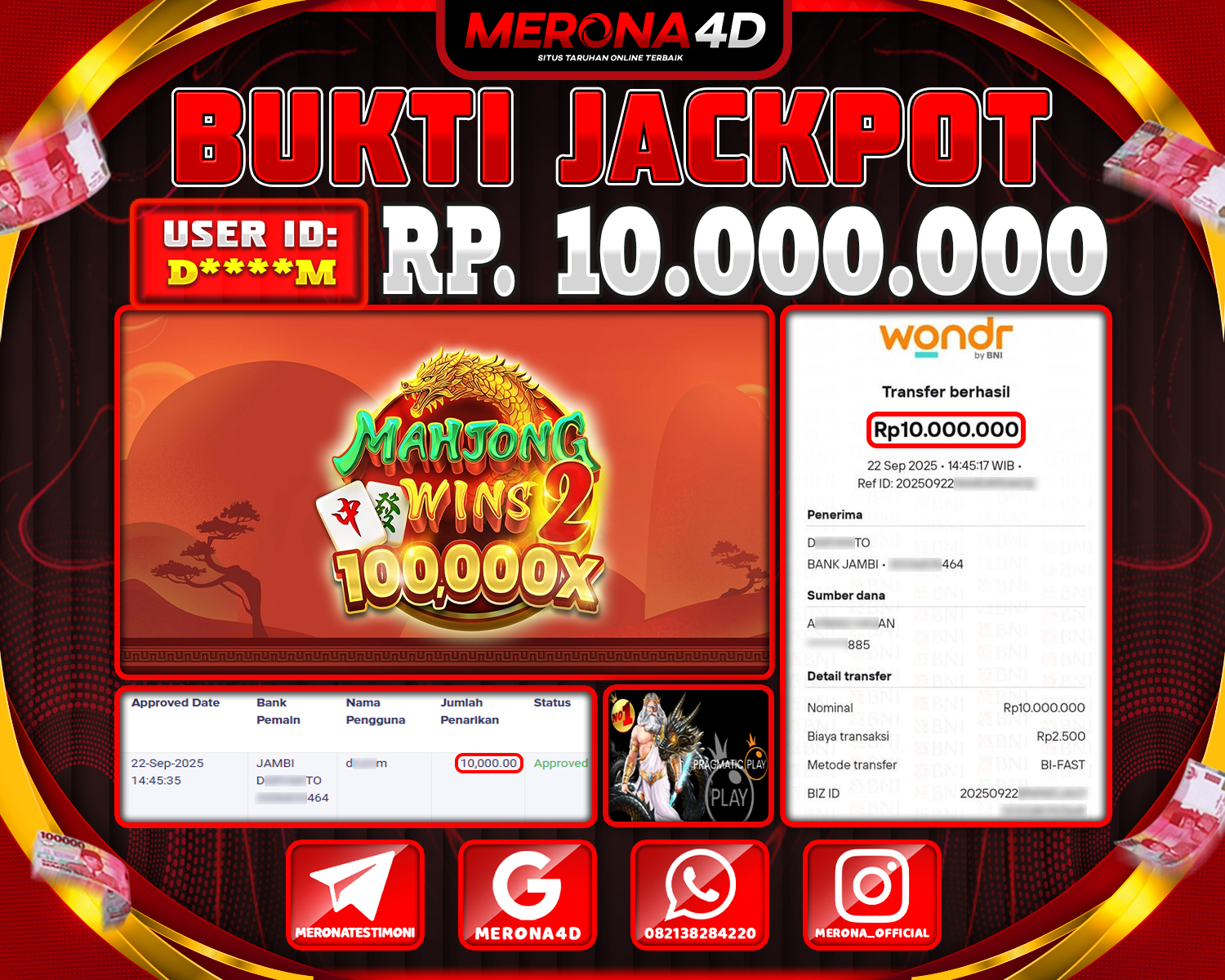 Selamat Kepada Member MERONA4D D*****8 Telah Jackpot Di MAHJONG WAYS 2