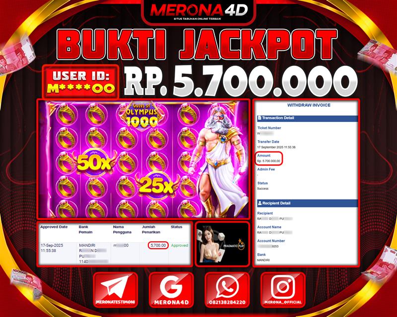 Selamat Kepada Member MERONA4D M******00 Telah Jackpot Di GATES OF OLYMPUS 1000