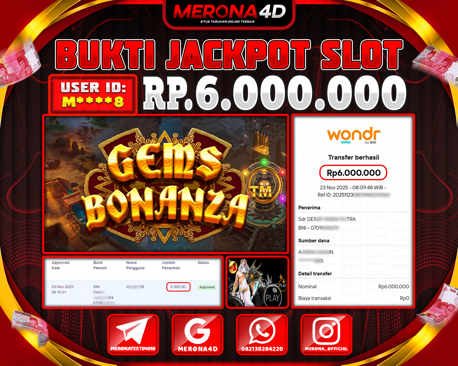 Selamat Kepada Member MERONA4D M****8 Telah Jackpot Di GEMS BONANZA