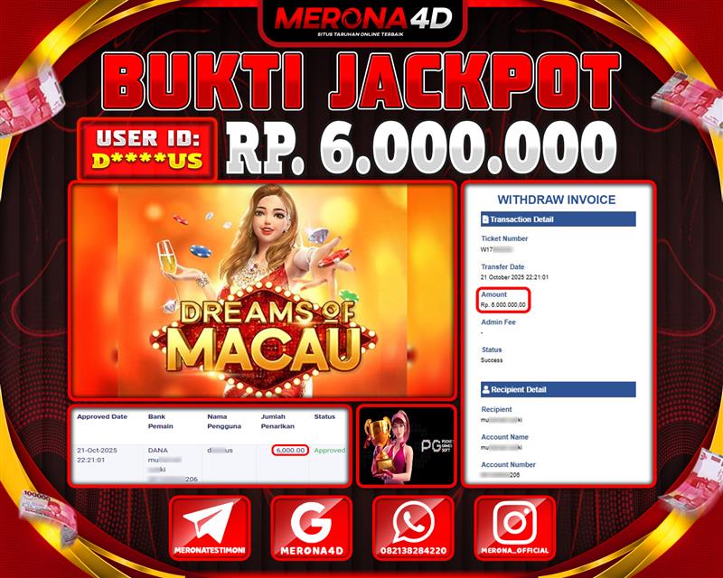 Selamat Kepada Member MERONA4D D*****US Telah Jackpot Di DREAMS OF MACAU