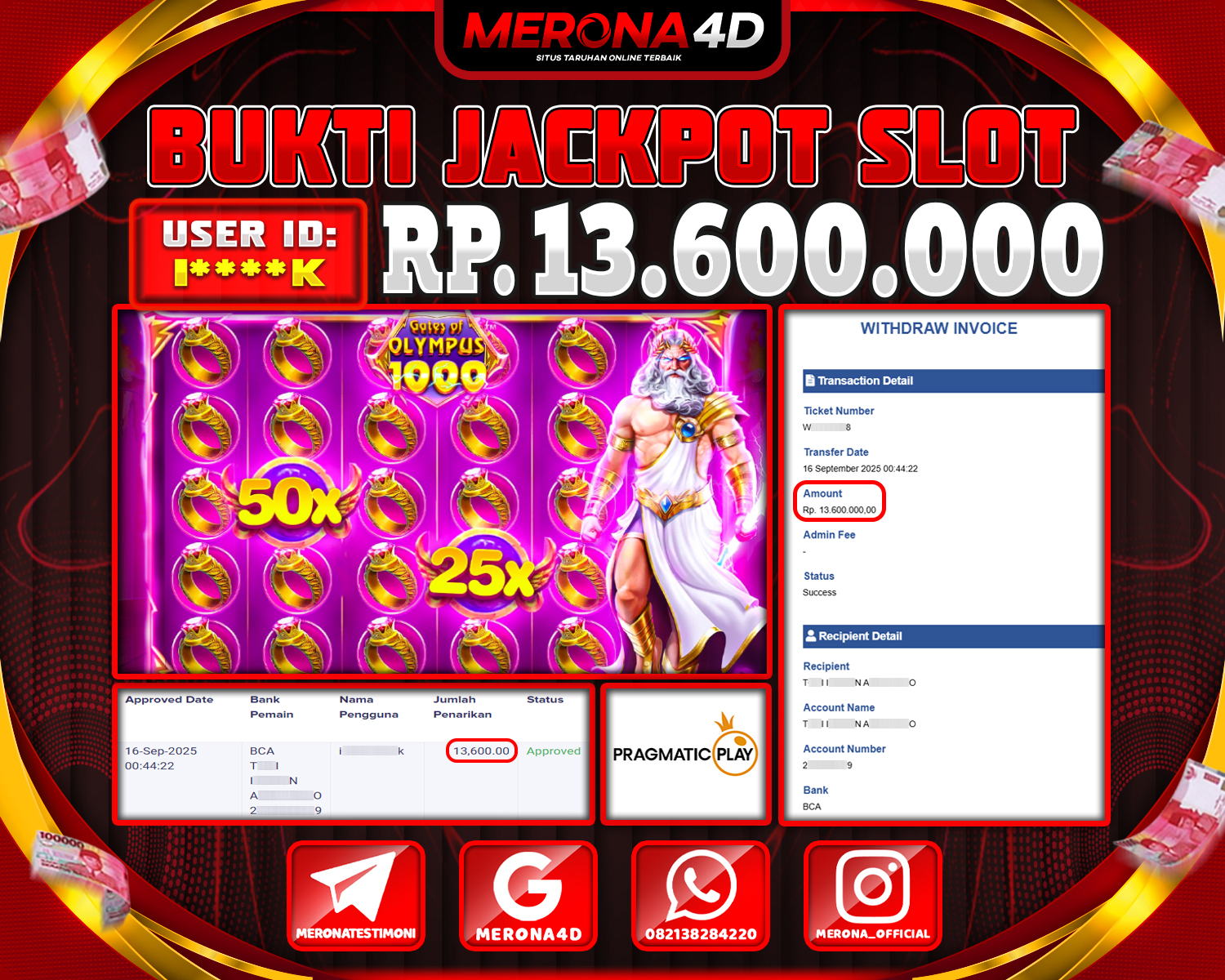 Selamat Kepada Member MERONA4D I****K Telah Jackpot Di GATES OF OLYMPUS 1000