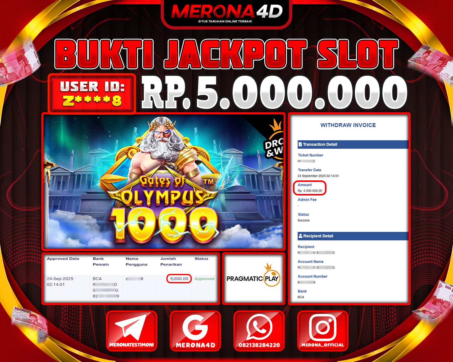 Selamat Kepada Member MERONA4D Z****8 Telah Jackpot Di GATES OF OLYMPUS 1000