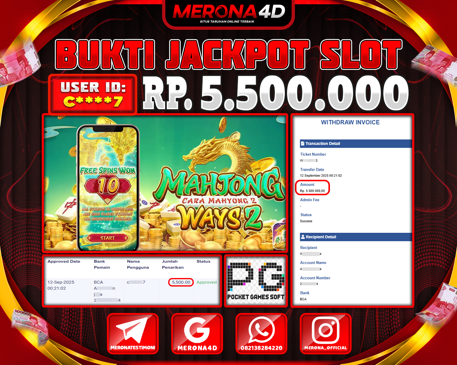 Selamat Kepada Member MERONA4D C****7 Telah Jackpot Di MAHJONG WAYS 2