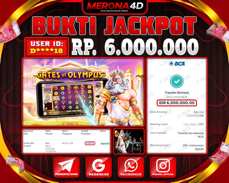 Selamat Kepada Member MERONA4D D*****18 Telah Jackpot Di GATES OF OLYMPUS
