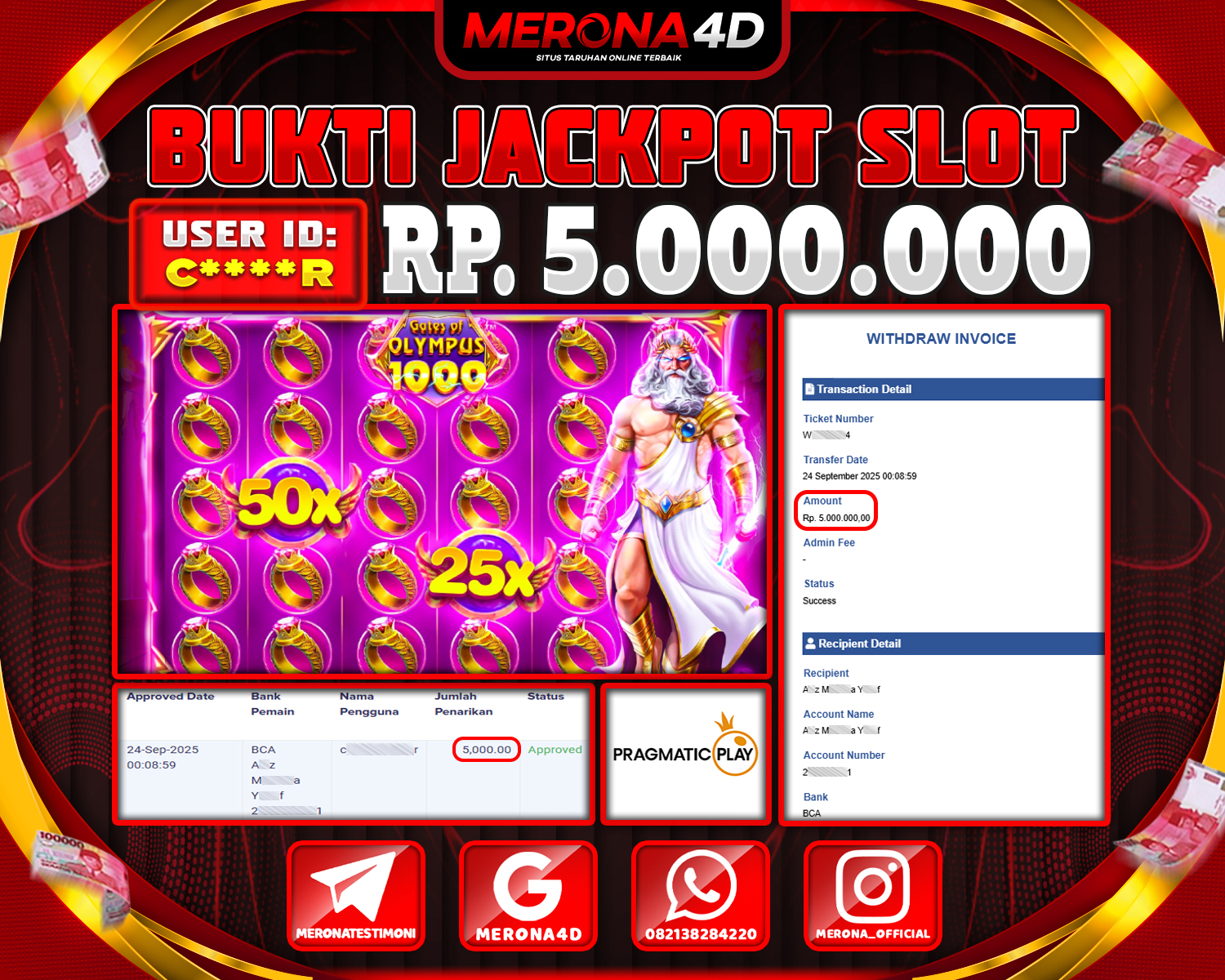 Selamat Kepada Member MERONA4D H****3 Telah Jackpot Di GATES OF OLYMPUS 1000