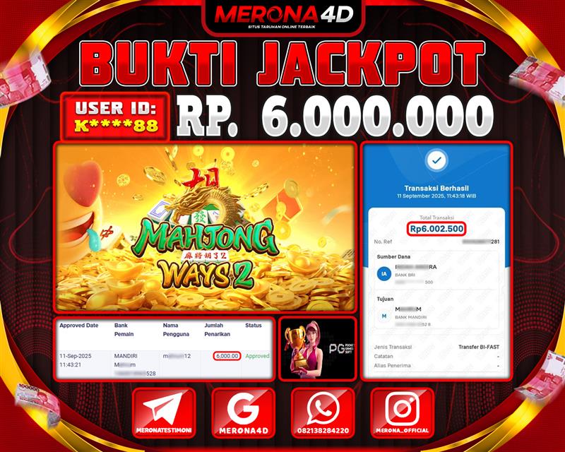 Selamat Kepada Member MERONA4D M*****12 Telah Jackpot Di MAHJONG WAYS 2