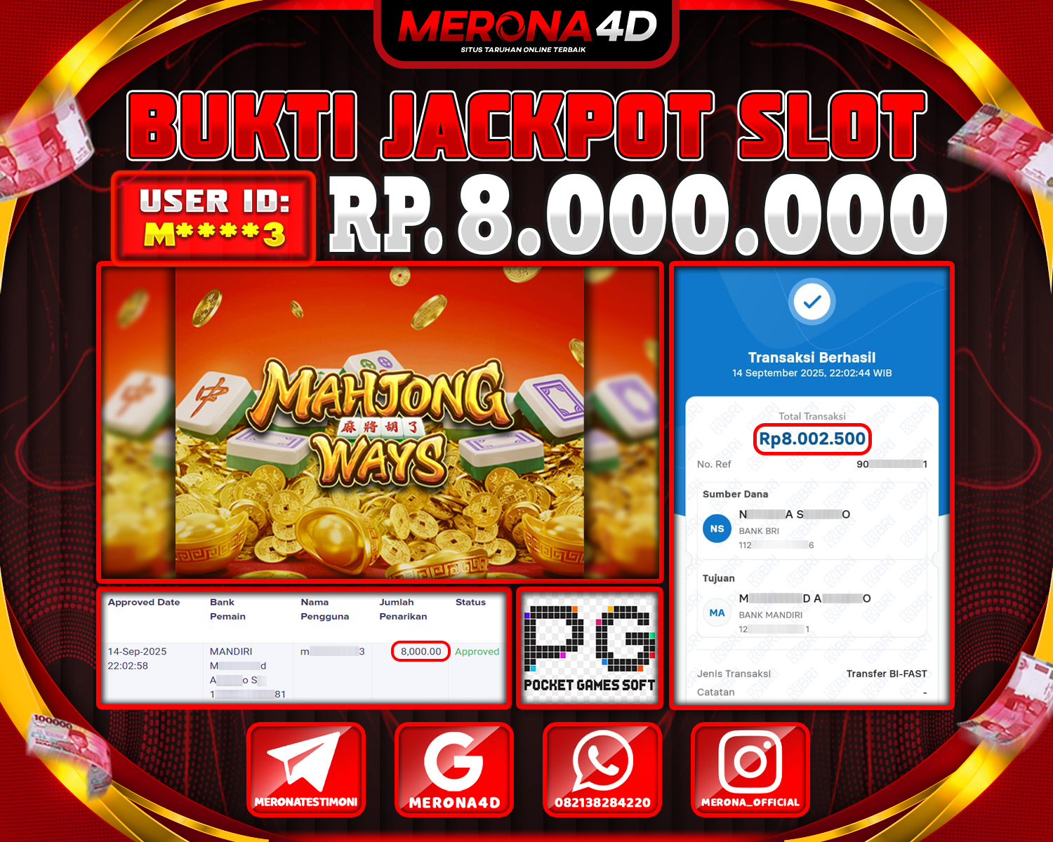 Selamat Kepada Member MERONA4D M****3 Telah Jackpot Di MAHJONG WAYS